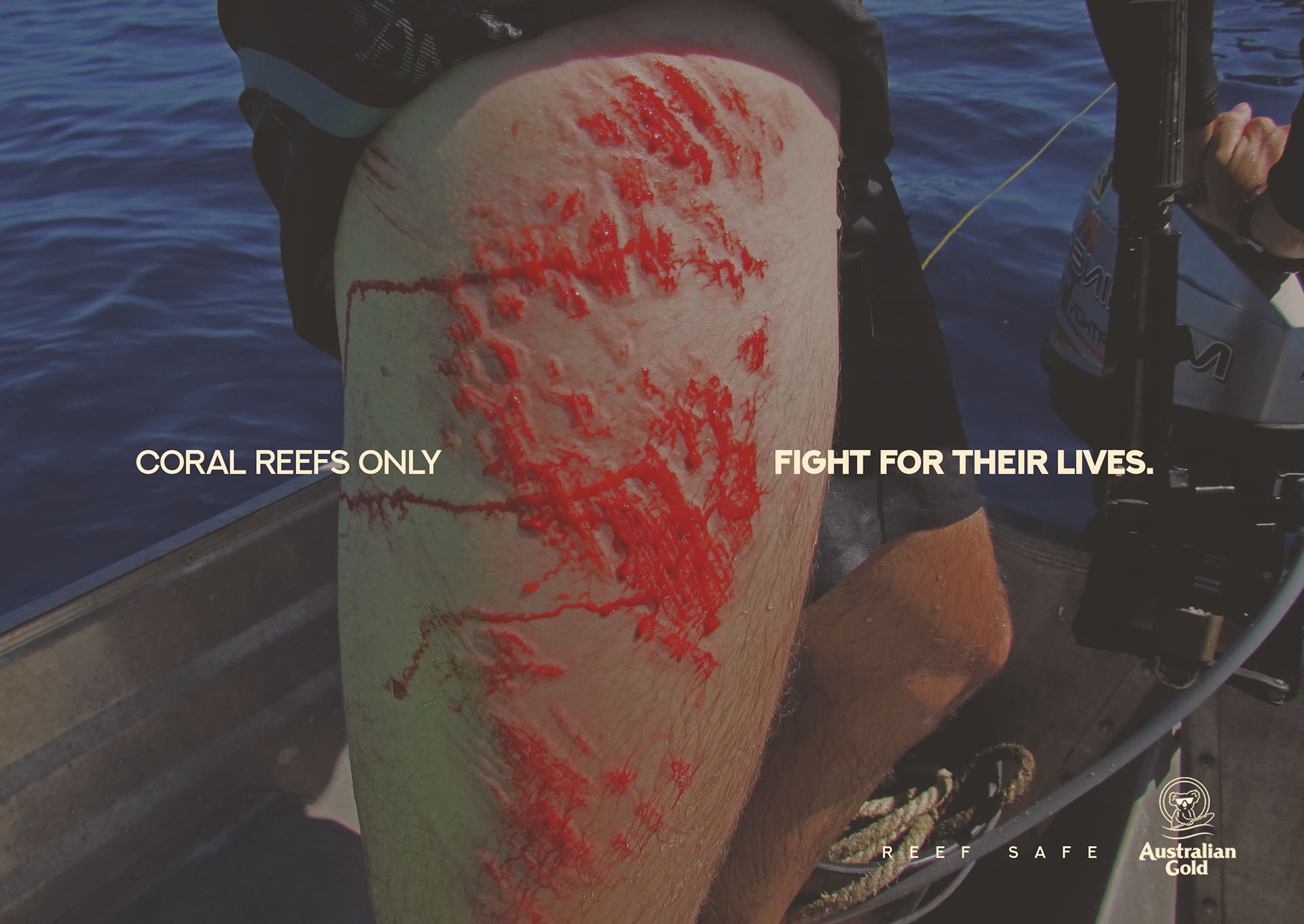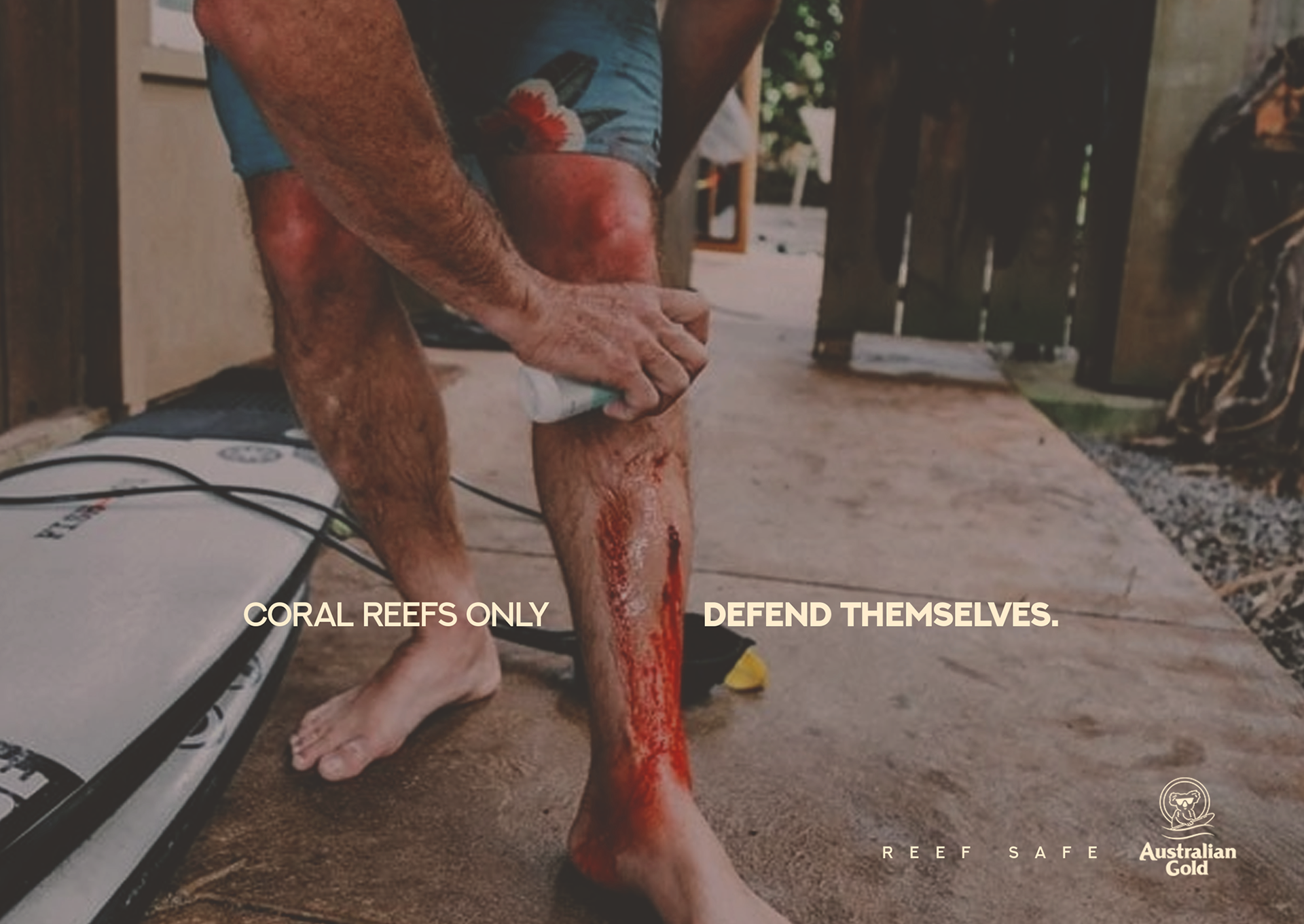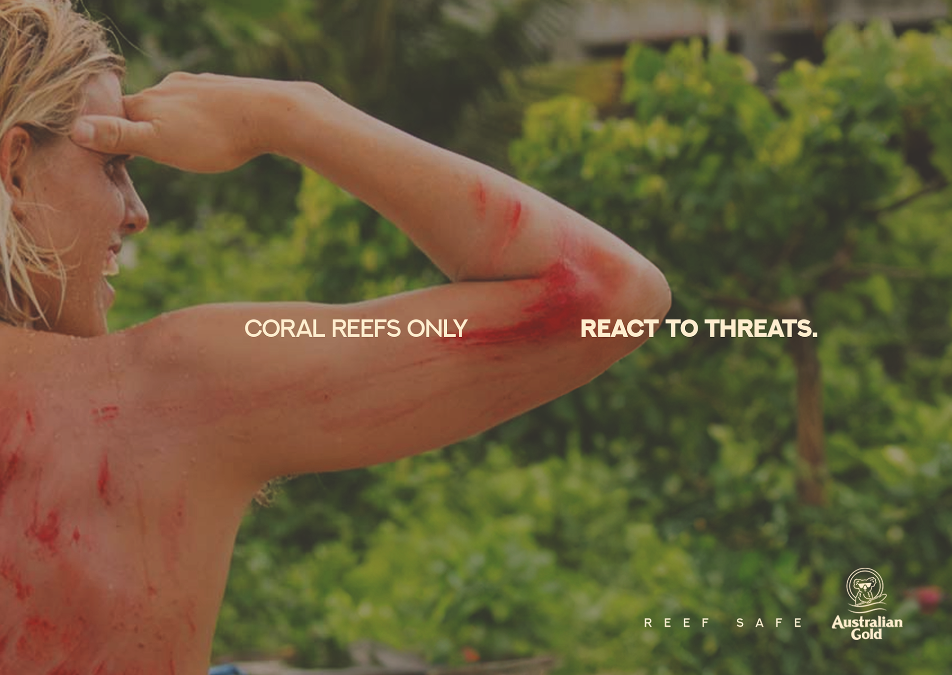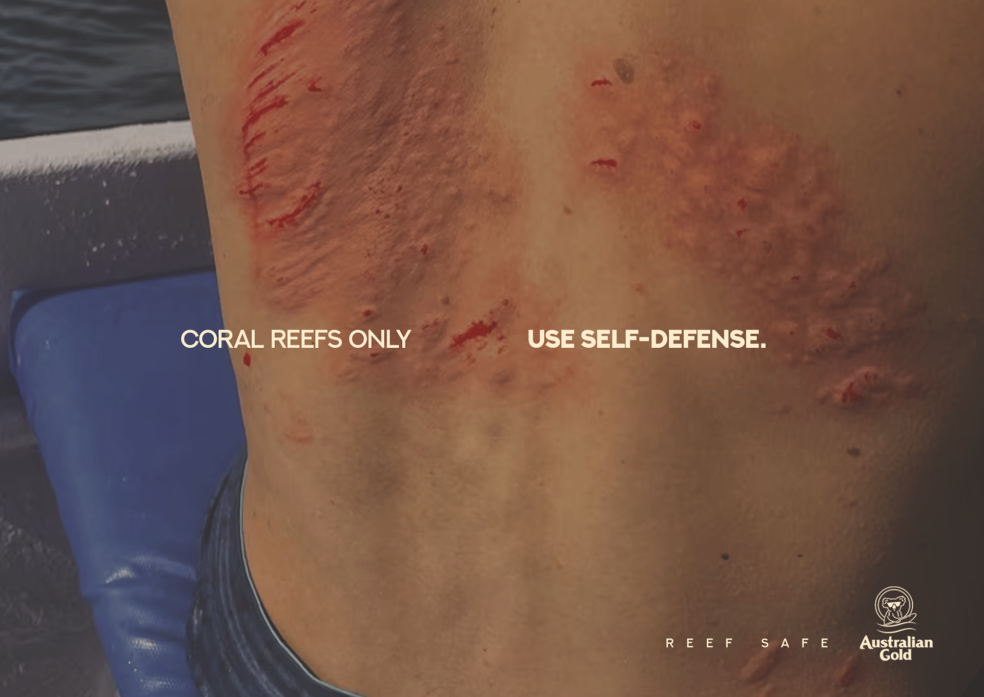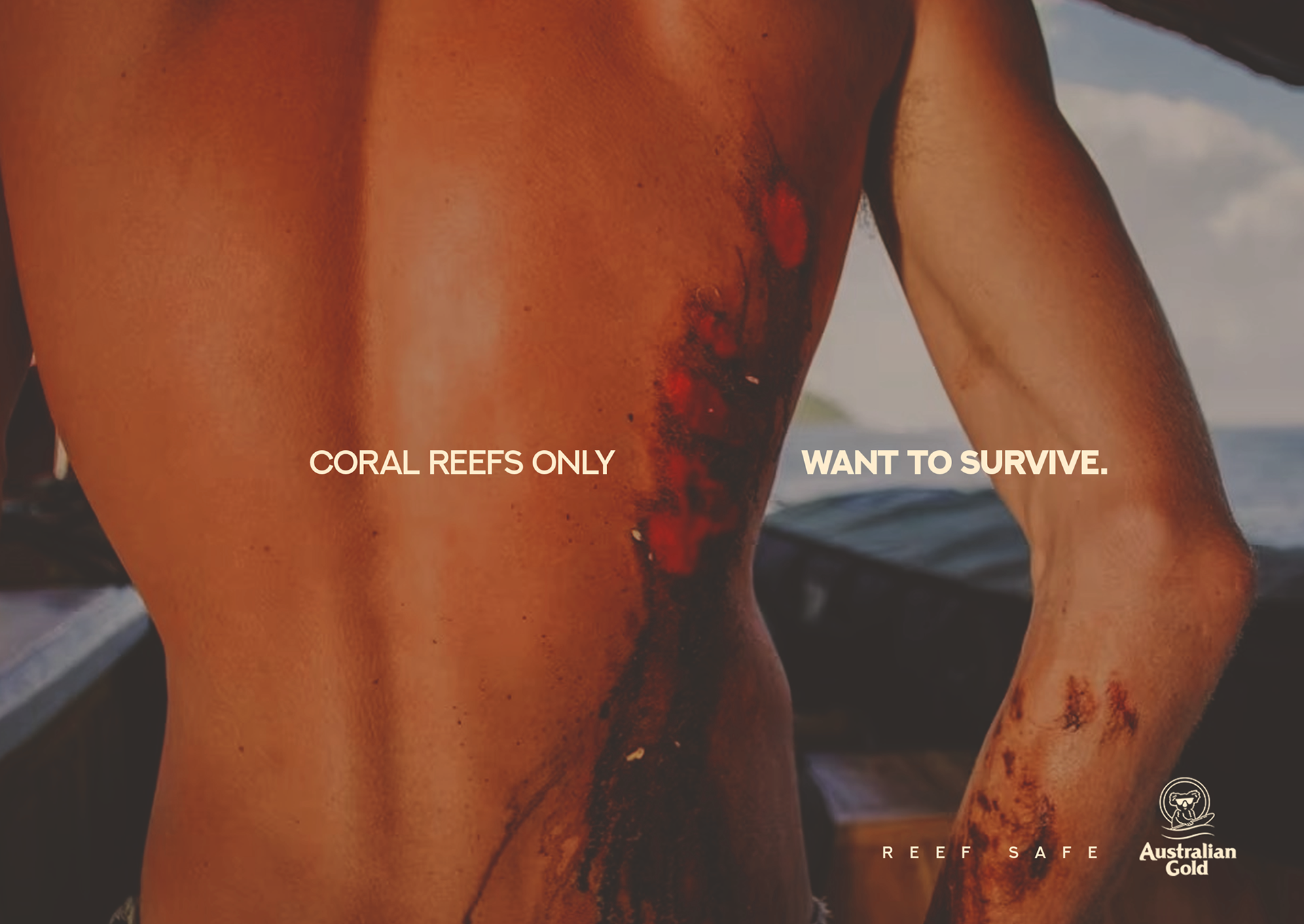 Work created for the sunscreen brand Australian Gold, which is free from chemicals that harm coral reefs. The print ads suggest that corals, too, have found ways to protect themselves from the damage caused by humans.